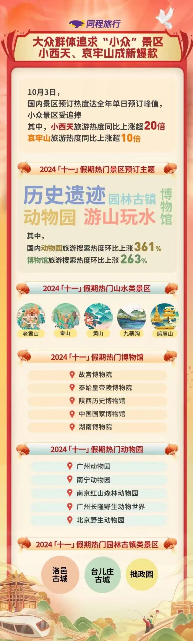除了這些“小眾”景點(diǎn)外,歷史遺跡、自然山水、動物園、博物館及園林古鎮(zhèn)是今年“十一”假期同程旅行平臺最受歡迎的景區(qū)主題。其中,國內(nèi)動物園的旅游搜索熱度環(huán)比上漲361%,博物館旅游熱度環(huán)比上漲263%。