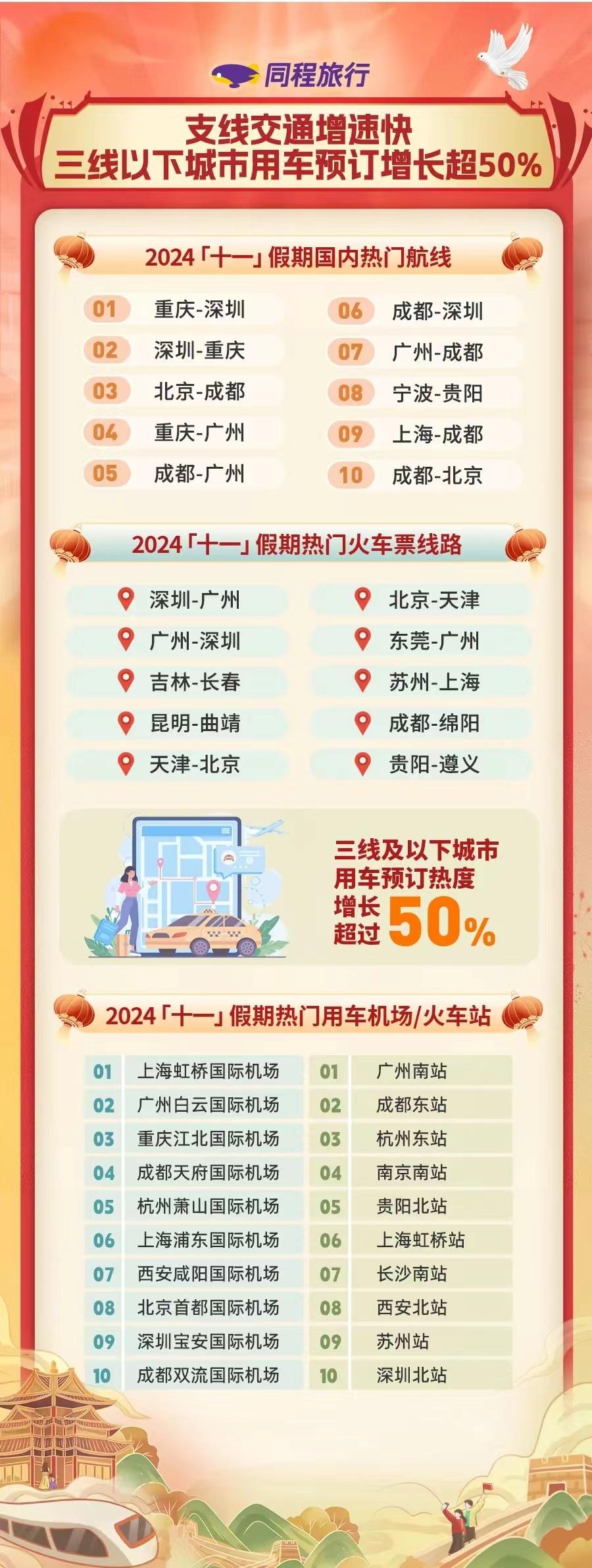 10月7日,同程旅行發(fā)布的《2024“十一”假期旅行消費(fèi)報告》顯示,2024年“十一”假期,國內(nèi)旅行消費(fèi)市場持續(xù)增長,二三線及以下城市居民出游消費(fèi)增長迅速。同程旅行平臺上,三線及以下城市用車預(yù)訂熱度增長超過50%;縣城文旅成假期消費(fèi)亮點(diǎn),全國近百個縣城酒店預(yù)訂熱度同比上漲超過50%。