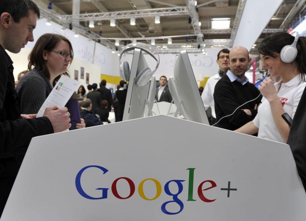這張資料照片顯示,2012年3月6日,在德國漢諾威會展中心舉行的漢諾威信息及通信技術(shù)博覽會上,參觀者在谷歌展臺參觀。新華社記者馬寧攝
