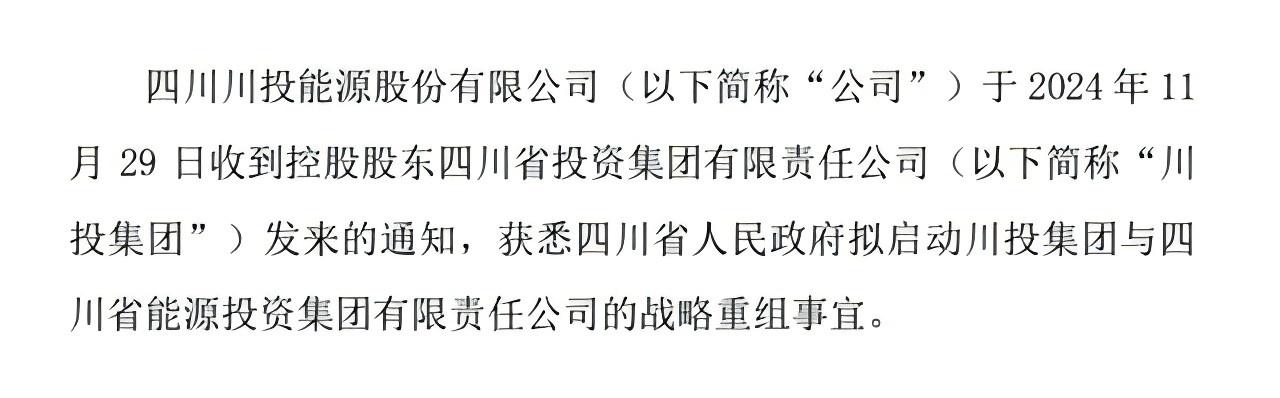 11月29日晚,川投能源、川能動力、華海清科3家A股公司披露,公司接到通知,獲悉四川省人民政府?dāng)M啟動四川省投資集團有限責(zé)任公司(簡稱“川投集團”)與四川省能源投資集團有限責(zé)任公司(簡稱“能投集團”)的戰(zhàn)略重組事宜。上述事宜涉及相關(guān)政府部門的批準,尚處于前期籌劃階段,能否獲得批準存在不確定性。