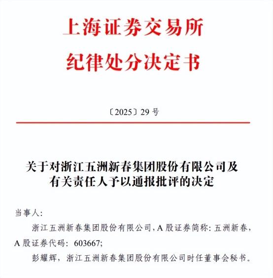 不過,五洲新春的這一系列動(dòng)作并未能完全消除市場(chǎng)的疑慮。在股價(jià)異動(dòng)后,公司雖然及時(shí)發(fā)布了澄清公告,但監(jiān)管機(jī)構(gòu)的處罰決定仍然如期而至。上交所對(duì)五洲新春及時(shí)任董事會(huì)秘書彭耀輝予以通報(bào)批評(píng),浙江證監(jiān)局也對(duì)五洲新春及彭耀輝分別采取了出具警示函的監(jiān)督管理措施,并記入證券期貨市場(chǎng)誠(chéng)信檔案。