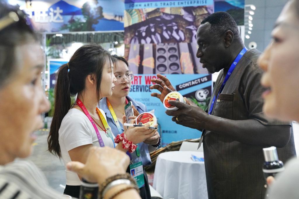 不遠(yuǎn)處的布隆迪展區(qū),當(dāng)?shù)卦现圃斓睦蹦咀延汀⒗蹦咀焉眢w香膏也吸引著不少專業(yè)觀眾前來問詢、試用。短短半天,已有20多個(gè)采購商留下對接方式。
