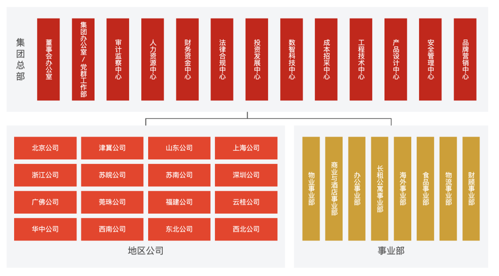 根據(jù)最新的組織架構(gòu),萬科集團(tuán)總部除了董事會(huì)辦公室、集團(tuán)辦公室/黨群工作部外,還設(shè)有投資發(fā)展中心、成本招采中心、工程技術(shù)中心、產(chǎn)品設(shè)計(jì)中心等11個(gè)中心;地區(qū)公司分為北京公司、津冀公司、山東公司、上海公司等16個(gè)公司;原物業(yè)事業(yè)集團(tuán)(BG)等統(tǒng)一歸為事業(yè)部,目前包含物業(yè)、商業(yè)與酒店、辦公、長(zhǎng)租公寓、物流等八大多元化業(yè)務(wù)。