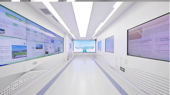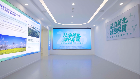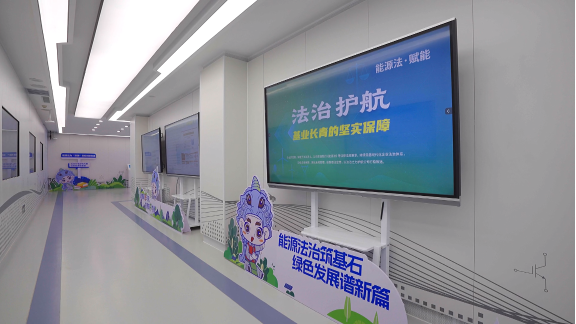 該基地占地約400平方米,配備數(shù)字互動終端、智慧調(diào)控系統(tǒng)、成果展示臺等設(shè)施。其展廳設(shè)計(jì)以“法治冀北·綠色希冀——能源法治守護(hù)綠水青山”為核心主題,設(shè)置序廳、“能源法·起航”、“能源法·踐行”、“能源法·未來”四大展區(qū),通過“圖片+視頻+講解”三位一體的展示方式,系統(tǒng)呈現(xiàn)能源法的立法背景、核心制度及重要意義。