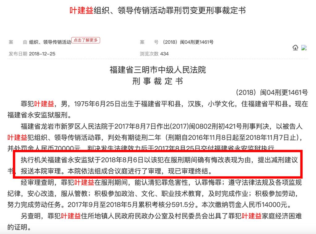 2018年12月,中國裁判文書網(wǎng)另披露過一份《葉建益組織、領(lǐng)導(dǎo)傳銷活動罪刑罰變更刑事裁定書》,福建省三明市中級人民法院公開的一份刑事裁定書顯示,執(zhí)行機關(guān)福建省永安監(jiān)獄于2018年8月6日以該犯在服刑期間確有悔改表現(xiàn)為由,提出減刑建議書,報送本院審理。本院認為,罪犯葉建益在服刑期間確有悔改表現(xiàn),符合減刑條件。裁定:對罪犯葉建益減去有期徒刑二個月,刑期自2016年11月8日起至2018年9月7日止。