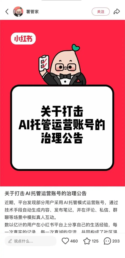 即日起,小紅書(shū)將對(duì)AI托管類(lèi)賬號(hào)實(shí)施以下治理措施: