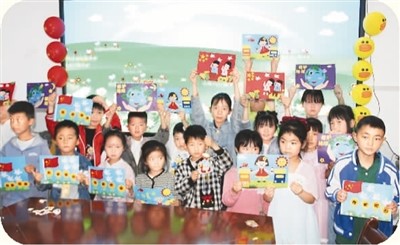 圖為孩子們在展示貼畫。古國凡、魏二濤攝影報(bào)道