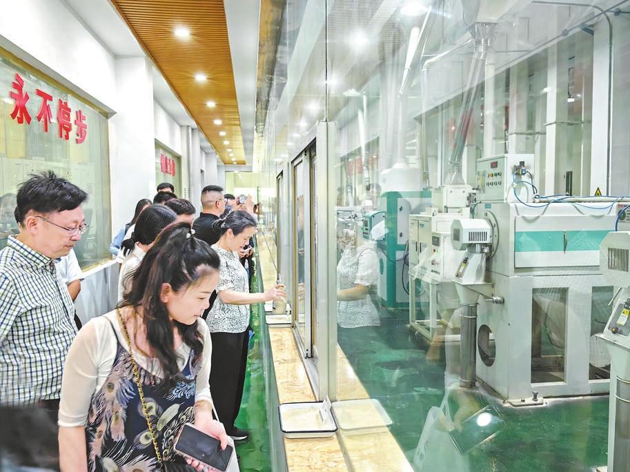 圖為7月7日,消費者在米業(yè)公司生產車間了解大米的生產工藝流程。