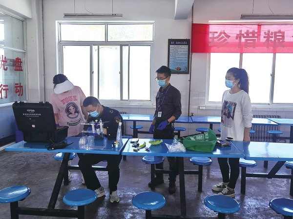 圖為華亭市策底鎮(zhèn)市場(chǎng)監(jiān)管部門執(zhí)法人員在轄區(qū)一所學(xué)校餐廳對(duì)抽樣的食材進(jìn)行現(xiàn)場(chǎng)快檢。于紅霞 史安良 文/攝