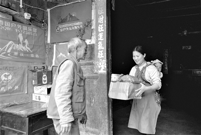 2020年下半年,漢源郵政在古路村設(shè)立了村郵站,村民通過(guò)電商平臺(tái)購(gòu)物變得更加方便,村里的花椒、核桃、臘肉等土特產(chǎn)品也拓寬了銷售渠道。圖為郵政代辦員向開(kāi)強(qiáng)(左)把包裹送到村民李娟家中?! ∮浾?江宏景 攝