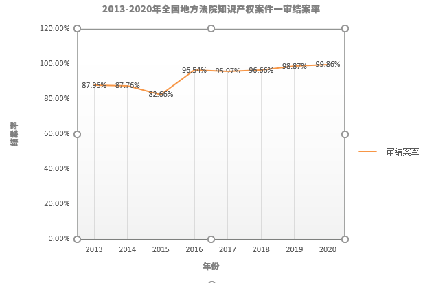 根據(jù)最高人民法院各年度知識產(chǎn)權(quán)司法保護(hù)白皮書(2013-2020年)公布的全國地方法院知識產(chǎn)權(quán)案件一審案件數(shù)和結(jié)案數(shù),計(jì)算得出全國地方法院知識產(chǎn)權(quán)案件一審結(jié)案率(表三)。