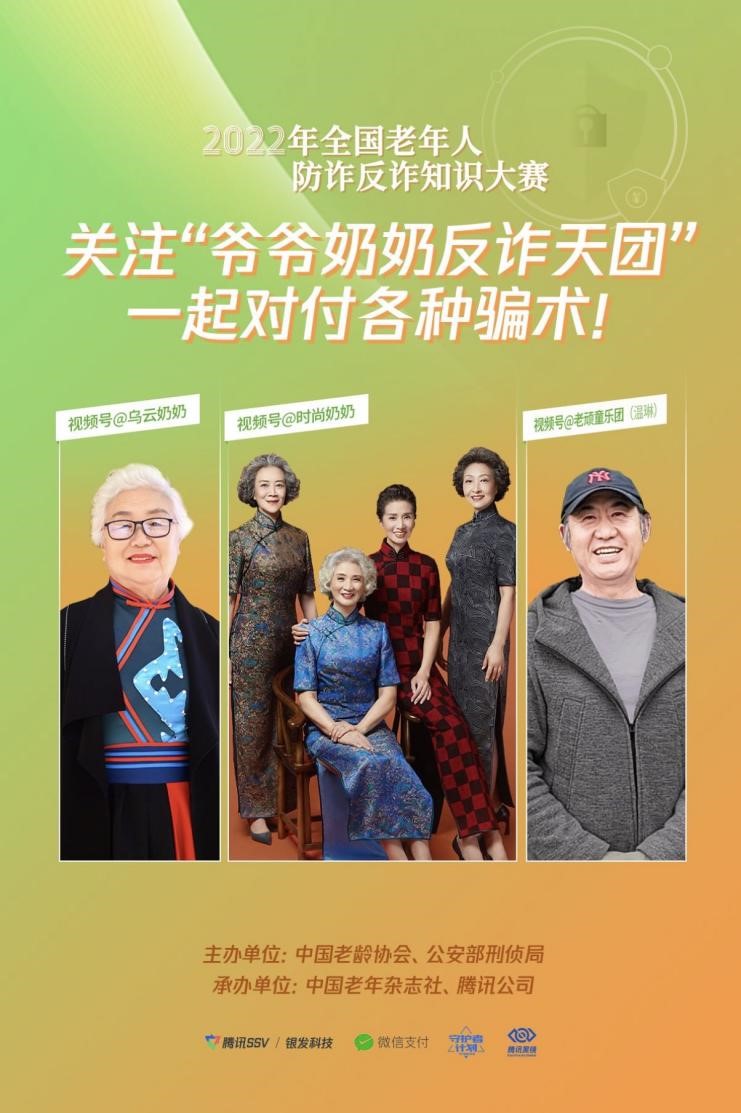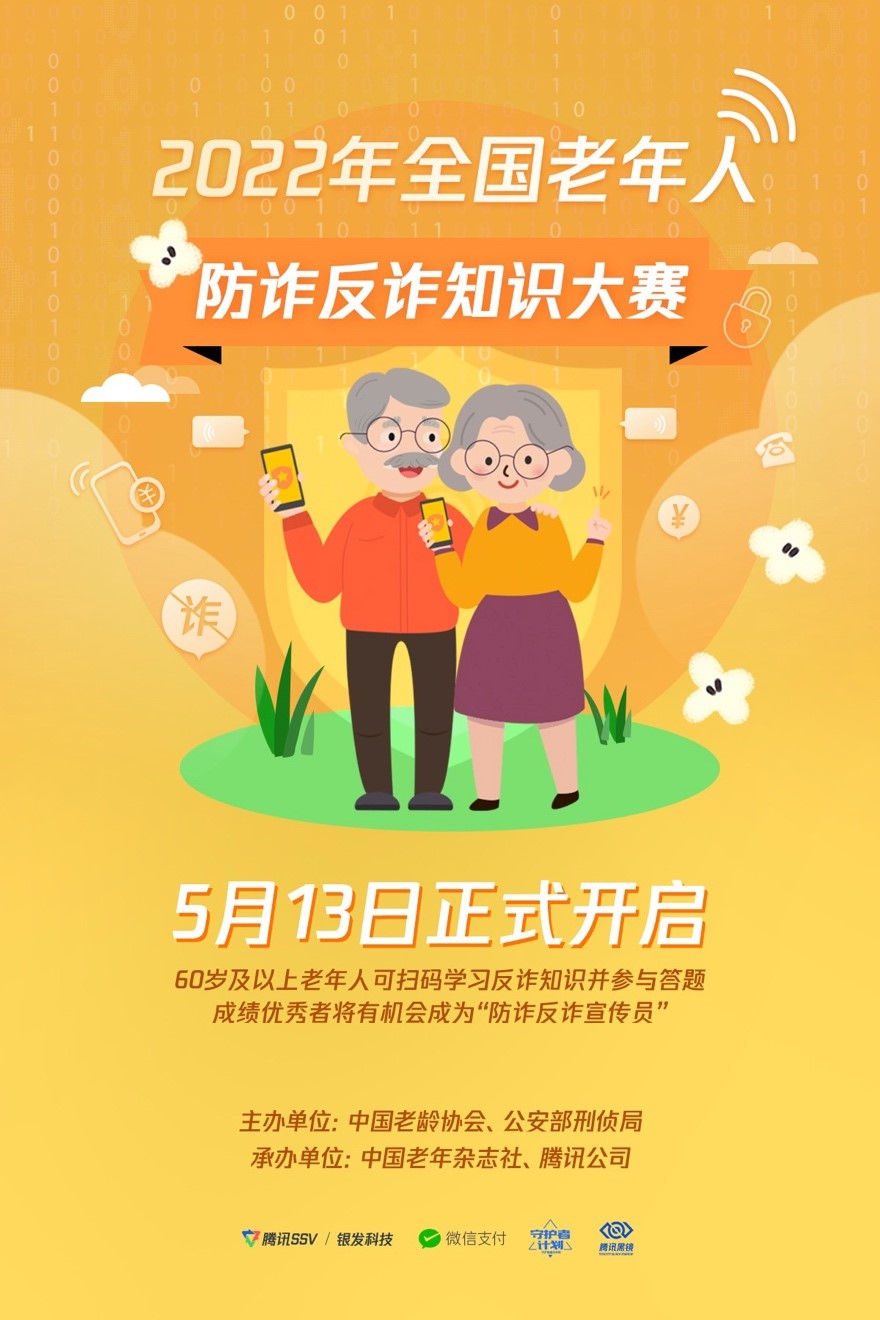 為提升老年群體防騙識騙能力,守護老年人的“錢袋子”, 5月13日,由中國老齡協(xié)會、公安部刑偵局主辦,中國老年雜志社、騰訊公司承辦的 “2022年全國老年人防詐反詐知識大賽”正式啟動。作為“全民反詐在行動”集中宣傳月的一項重要活動,大賽通過線上線下反詐知識科普、反詐知識競答等多種方式為老年人普及反詐知識。