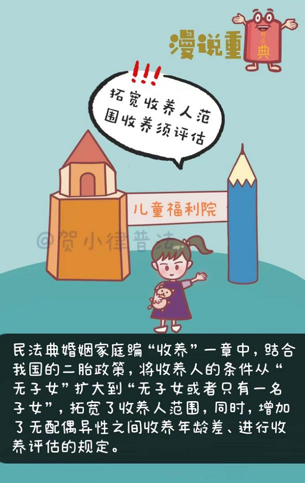 民法典婚姻家庭編“收養(yǎng)”一章中,結(jié)合我國的二胎政策,將收養(yǎng)人的條件從“無子女”擴(kuò)大到“無子女或者只有一名子女”,拓寬了收養(yǎng)人的范圍,同時(shí),增加了無配偶異性之間收養(yǎng)年齡差、進(jìn)行收養(yǎng)評估的規(guī)定。