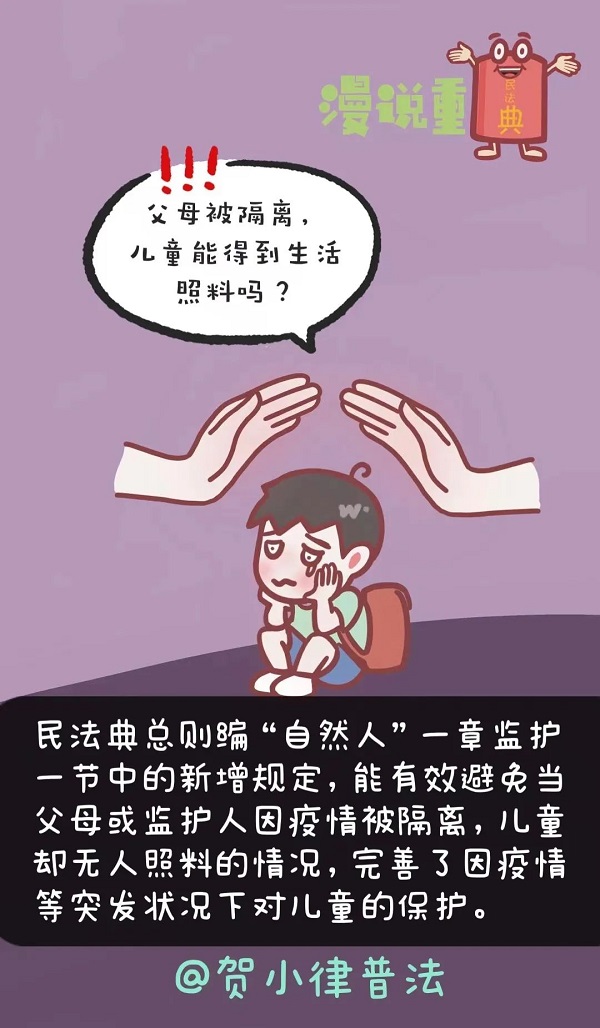 民法典總則編“自然人”一章監(jiān)護(hù)一節(jié)中的新增規(guī)定,能有效避免當(dāng)父母或監(jiān)護(hù)人因疫情被隔離,兒童卻無人照料的情況,完善了因疫情等突發(fā)狀況下對兒童的保護(hù)。