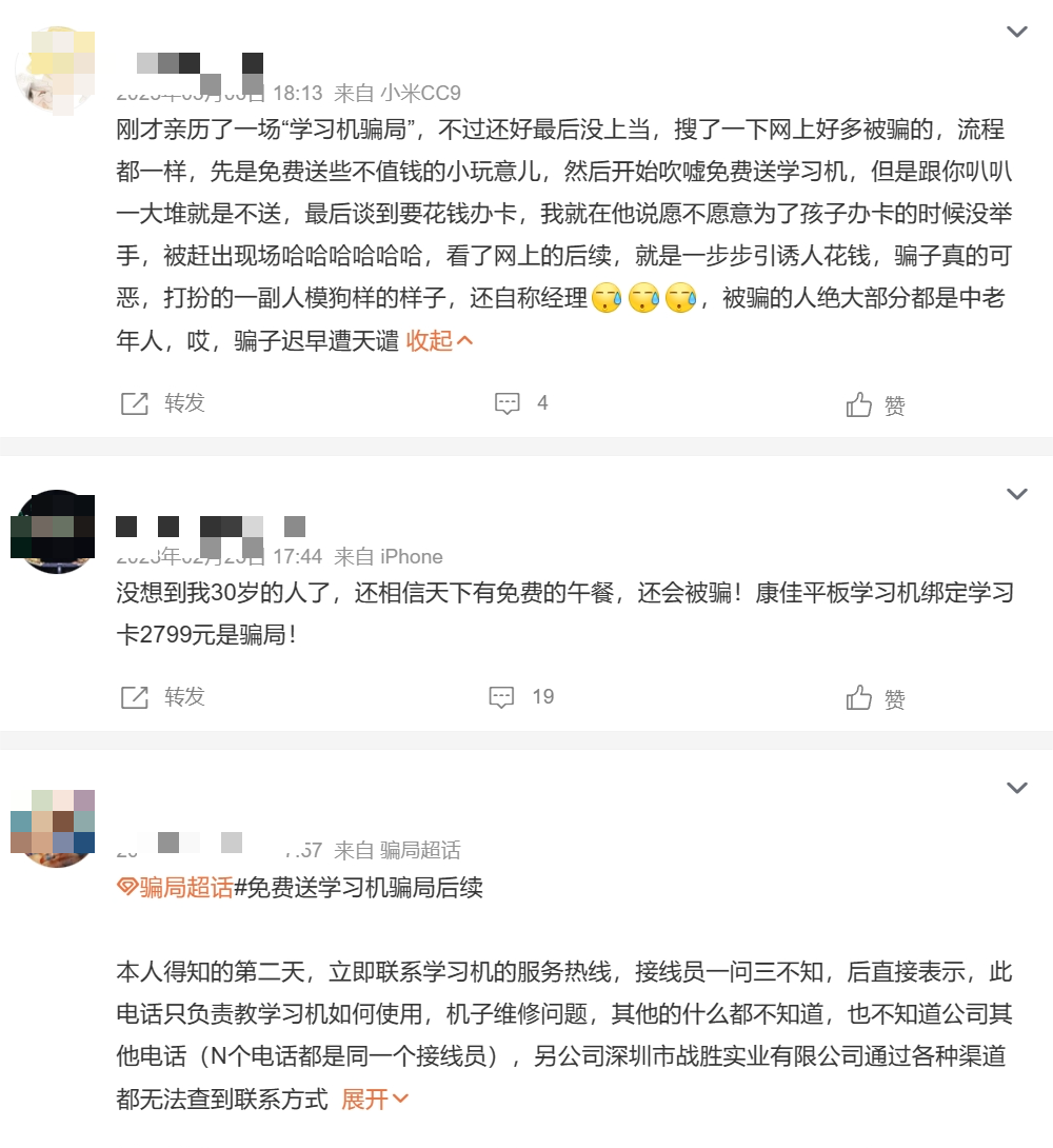 記者搜索發(fā)現(xiàn),這類以免費送學(xué)習(xí)機、學(xué)習(xí)平板為幌子,捆綁銷售高價課程的誘騙式消費不在少數(shù),僅黑貓投訴關(guān)于“學(xué)習(xí)機騙局”的投訴就高達(dá)380余條,其中大部分都是采用上述套路。