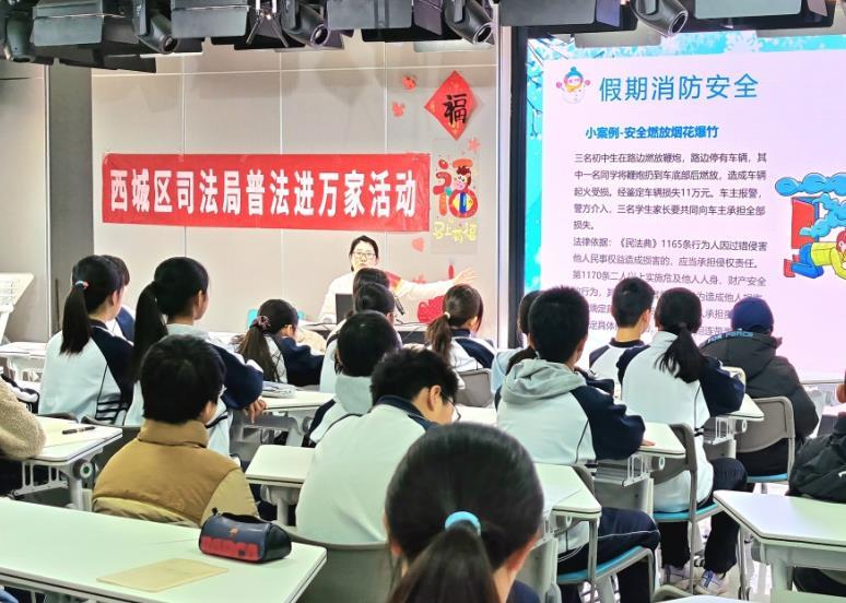 1月23日,北京市西城區(qū)司法局晨夕普法團(tuán)隊聯(lián)合區(qū)學(xué)生綜合實踐活動中心、北京市第十三中學(xué),舉辦“寒假來臨 安全先行”安全教育普法講座。圖為律師在現(xiàn)場與同學(xué)們積極互動。