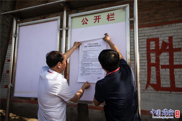 征收土地和補償安置公告,主要包括項目批準情況、被征收土地情況、土地補償情況、房屋及附屬物、附著物及青苗補償情況、安置辦法和其他事項等六部分內(nèi)容。圖為駐村干部在小王營村張貼公告。中國雄安官網(wǎng)記者劉東堯 攝