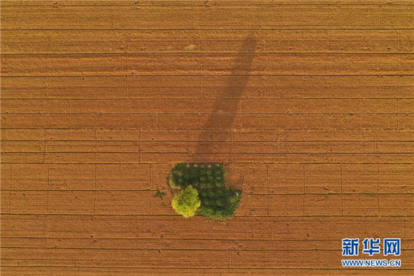 6月13日無(wú)人機(jī)拍攝的雄安新區(qū)大王鎮(zhèn)小王村成熟的麥田。 近日,雄安新區(qū)小麥陸續(xù)成熟,當(dāng)?shù)卮迕駬屪マr(nóng)時(shí)進(jìn)行收獲。 新華社記者 朱旭東 攝