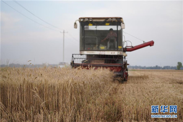 6月13日,雄安新區(qū)大王鎮(zhèn)小王村村民在收獲小麥。 近日,雄安新區(qū)小麥陸續(xù)成熟,當?shù)卮迕駬屪マr(nóng)時進行收獲。 新華社記者 朱旭東 攝