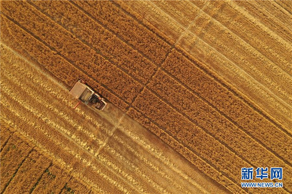 6月13日,雄安新區(qū)大王鎮(zhèn)小王村村民在收獲小麥(無(wú)人機(jī)拍攝)。 近日,雄安新區(qū)小麥陸續(xù)成熟,當(dāng)?shù)卮迕駬屪マr(nóng)時(shí)進(jìn)行收獲。 新華社記者 邢廣利 攝