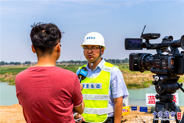 南拒馬河防洪治理工程項(xiàng)目負(fù)責(zé)人李青山向記者介紹工程進(jìn)展情況。中國雄安官網(wǎng)記者馬夢(mèng)迪 攝