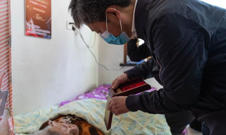 84歲的徐敏老人17歲應(yīng)征入伍,參加過抗美援朝戰(zhàn)役。他雖然年事已高,但仍然精神抖擻、聲音洪亮。高立春一行來到徐敏家中,與他親切交談,并送上米、面、油、牛奶等慰問品。高立春對老人投身抗美援朝、經(jīng)歷浴血奮戰(zhàn)的大無畏精神表示敬意,感謝他們?yōu)樾轮袊鞒龅呢暙I(xiàn),并親自為他佩戴上“中國人民志愿軍抗美援朝出國作戰(zhàn)70周年”紀(jì)念章。同時,高立春還要求相關(guān)部門和工作人員要時刻關(guān)心、照顧好老人,及時主動地幫助老人解決生活困難,并叮囑老人有任何困難第一時間找退役軍人服務(wù)中心這個“娘家人”。