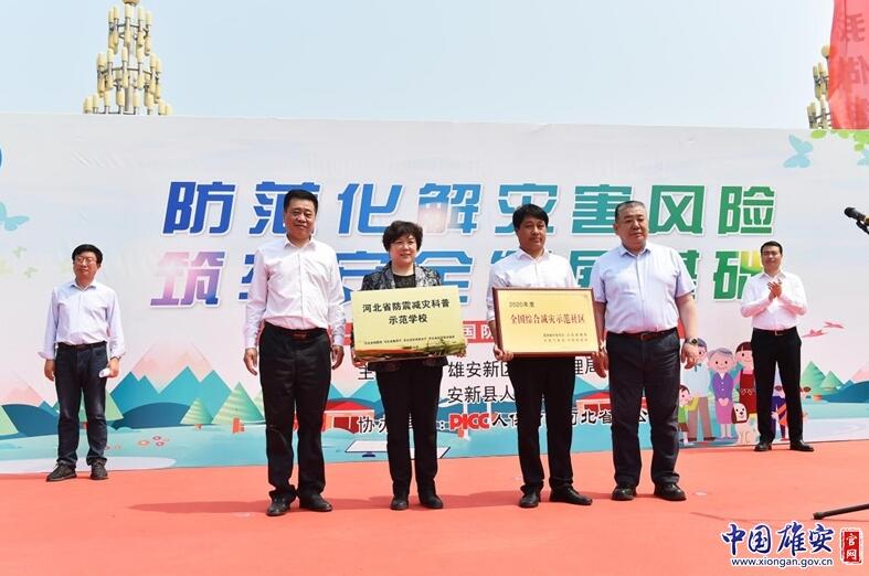 在全國(guó)防災(zāi)減災(zāi)日宣傳活動(dòng)現(xiàn)場(chǎng),戴泊生向安新小學(xué)頒發(fā)省級(jí)地震科普教育示范學(xué)校牌匾,劉樹(shù)軍向東淀頭村頒發(fā)全國(guó)綜合減災(zāi)示范社區(qū)牌匾,兩位領(lǐng)導(dǎo)共同向雄州救援隊(duì)、雄風(fēng)救援隊(duì)、藍(lán)天救援隊(duì)、美團(tuán)代表隊(duì)等新區(qū)安全宣傳志愿者隊(duì)伍代表授旗。中國(guó)人民財(cái)產(chǎn)保險(xiǎn)股份有限公司雄安分公司籌建負(fù)責(zé)人張友林為活動(dòng)致開(kāi)幕詞,中國(guó)福利基金會(huì)支持雄安公益基金執(zhí)行主任、北京支持雄安產(chǎn)業(yè)發(fā)展促進(jìn)會(huì)常務(wù)副會(huì)長(zhǎng)兼秘書(shū)長(zhǎng)彌雪向雄安新區(qū)捐贈(zèng)了高空細(xì)水霧滅火消防車(chē)。
