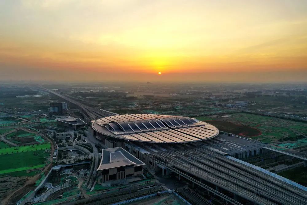 7月1日在河北雄安新區(qū)京雄城際鐵路雄安站拍攝的日出(無(wú)人機(jī)照片)。新華社記者牟宇 攝