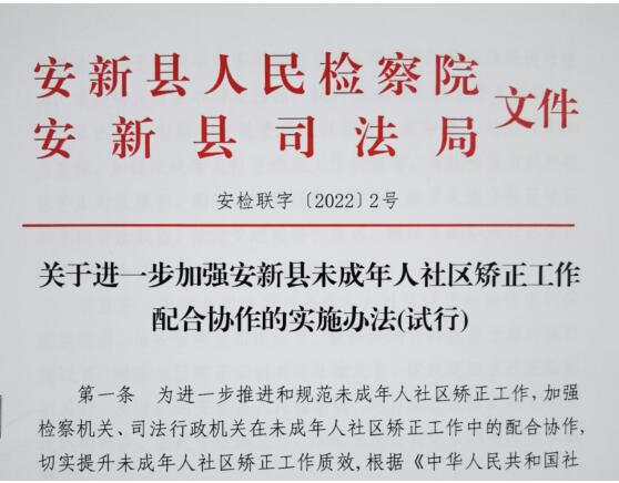 在高墻之外,未檢檢察官發(fā)現(xiàn)當?shù)厣鐓^(qū)矯正機構對未成年社區(qū)矯正對象未制定個性化矯正方案和針對性的矯正措施,且未按規(guī)定轉送法律文書、抄送調查評估報告和解除社區(qū)矯正證明書問題較為普遍。為此,安新縣檢察院向安新縣司法局發(fā)出檢察建議,與縣司法局專門召開進一步規(guī)范未成年人社區(qū)矯正工作會,推動相關問題得到及時整改,并于2022年3月與縣司法局會簽了《關于進一步加強安新縣未成年人社區(qū)矯正工作配合協(xié)作的實施辦法》,建立長效監(jiān)督、配合與協(xié)作工作機制。