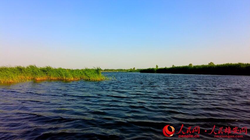 清澈的白洋淀與蘆葦,形成一幅藍綠交織的美好畫卷。高騰攝