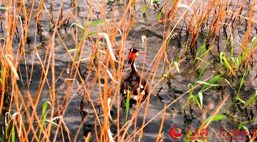 鳥兒背負雛鳥穿梭于蘆葦蕩中,畫面溫馨有愛。高騰攝