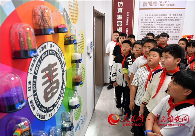 4月19日,雄安容和海棠小學(xué)的同學(xué)們正在禁毒教育體驗區(qū)內(nèi)學(xué)習(xí)禁毒知識。人民網(wǎng) 宋燁文攝