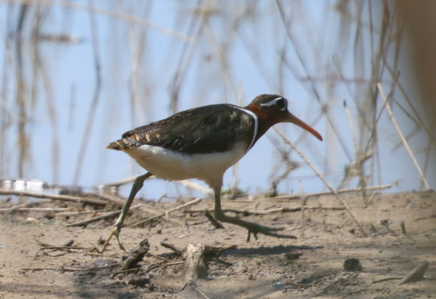 彩鷸體長25厘米左右,嘴細(xì)長,尖端向下彎曲,虹膜褐色,嘴橙色、黃褐色。彩鷸棲息于平原、丘陵和山地中的蘆葦水塘、沼澤、河渠、河灘草地和水稻田中,主要以水蚯蚓、蝦、蟹、螺、昆蟲為食,也吃植物葉、芽、種子和谷物。