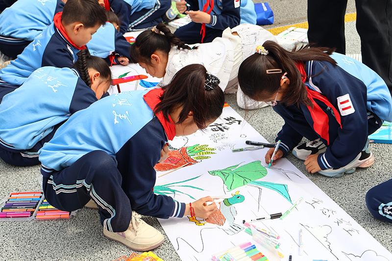 安新縣雁翎小學(xué)以“童心繪國安 長卷載山河”為主題,開展十米長卷集體創(chuàng)作活動。雄安新區(qū)教育局供圖