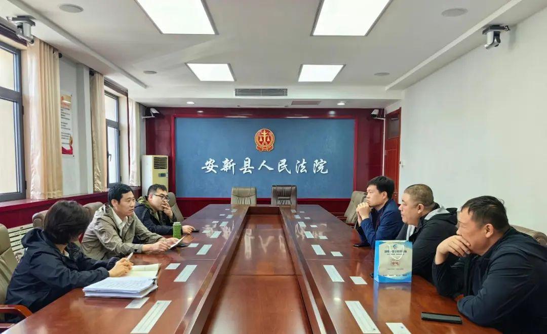 安新法院干警與安新縣公共服務局勞動保障調(diào)解委員會工作人員對司法確認程序進行溝通。