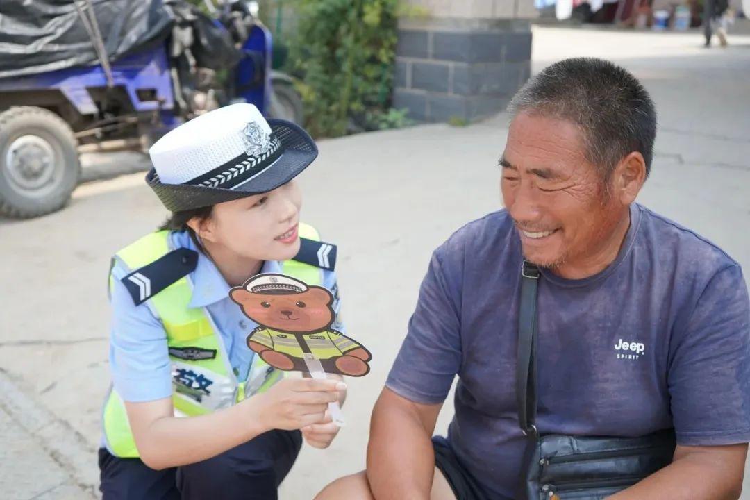 “叔,拿把扇子涼快涼快,聽(tīng)我嘮兩句。”民警手持印著卡通小熊的宣傳扇,開(kāi)啟“嘮嗑模式”。