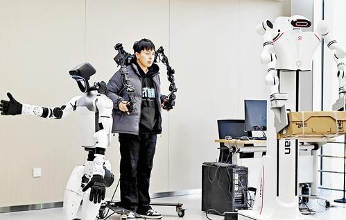 近日,在中國(guó)雄安集團(tuán)數(shù)字城市科技有限公司的具身智能訓(xùn)練場(chǎng)內(nèi),數(shù)據(jù)采集員正對(duì)異構(gòu)機(jī)器人進(jìn)行具身智能訓(xùn)練。記者劉光昱 攝