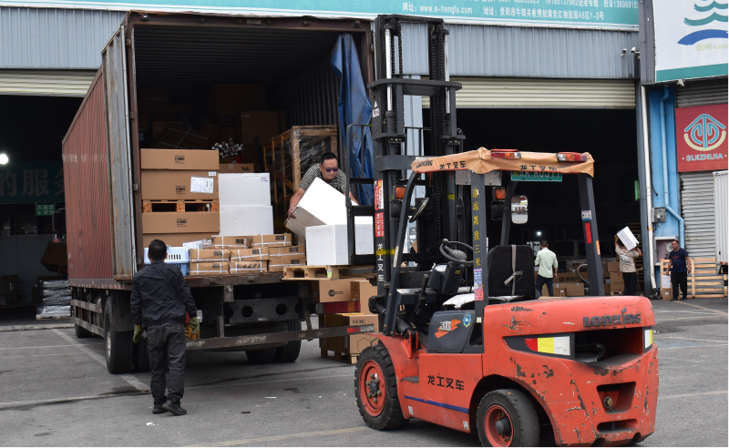 入口處,一輛輛貨車拖著長長的尾箱魚貫駛?cè)耄粓@區(qū)內(nèi),100余輛叉車往來穿梭,不停地卸貨、裝貨。
