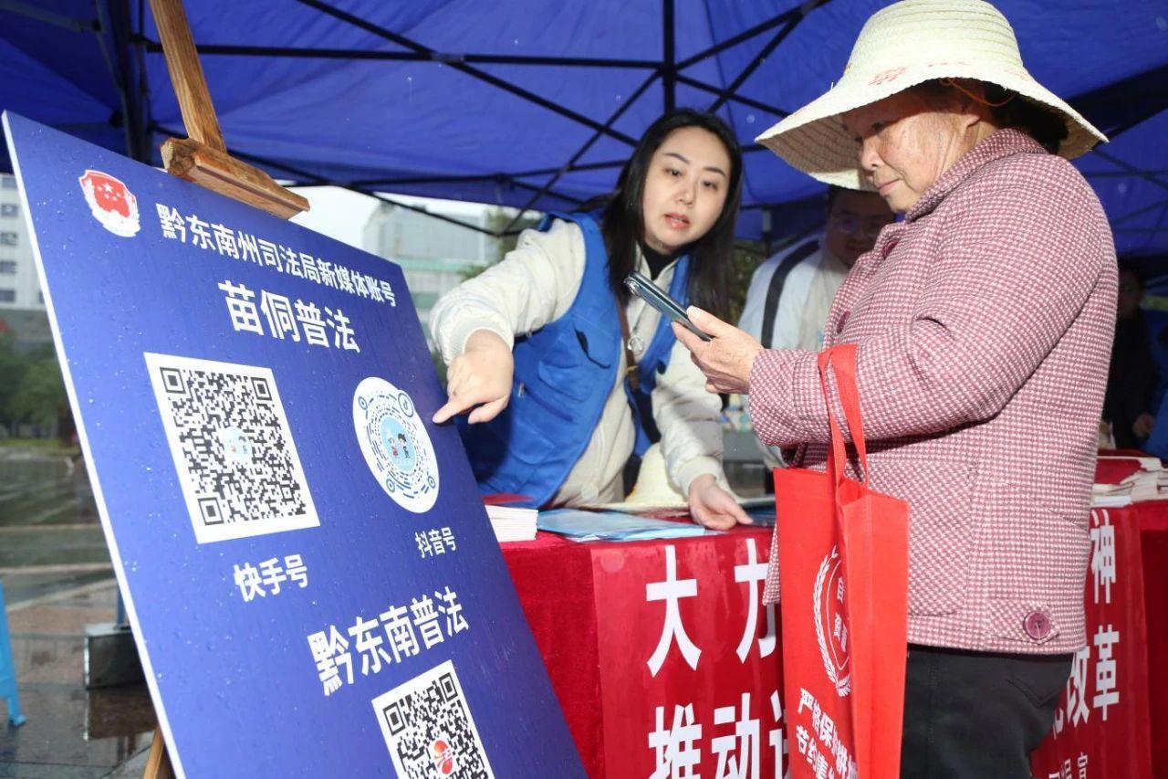 12月4日,法治宣傳志愿者在貴州省黔東南苗族侗族自治州凱里市萬博廣場引導群眾掃碼學法。(鄒光學 攝)