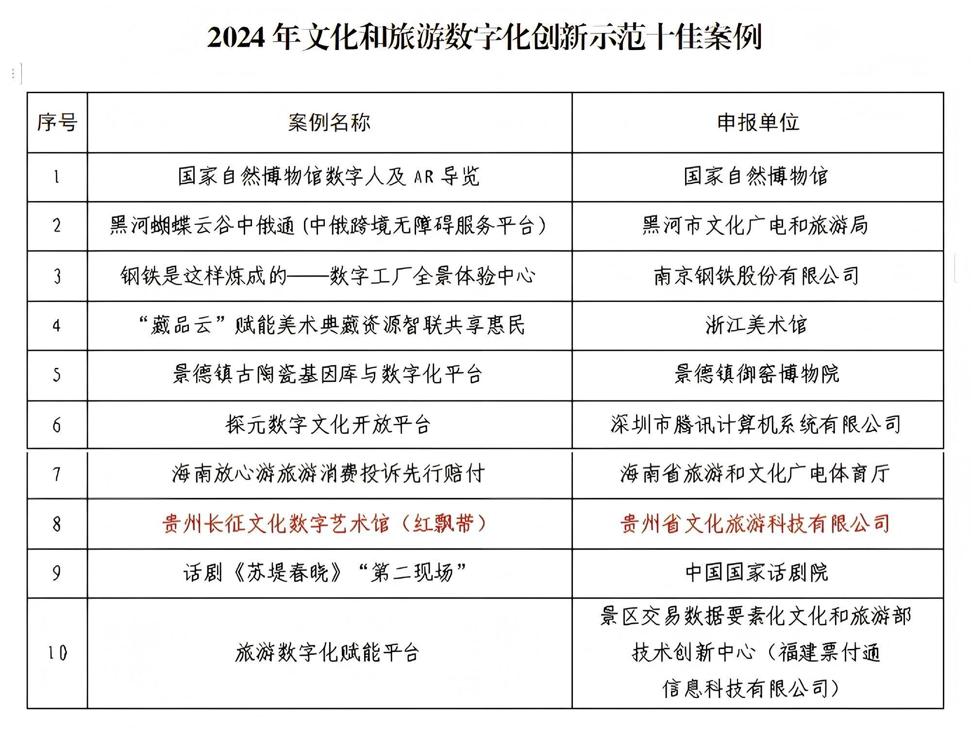 近日,文化和旅游部公布了2024年文化和旅游數(shù)字化創(chuàng)新示范十佳案例,集中示范推廣文化和旅游領(lǐng)域數(shù)字化創(chuàng)新的最新成果。“貴州長(zhǎng)征文化數(shù)字藝術(shù)館(紅飄帶)”入選2024年文化和旅游數(shù)字化創(chuàng)新示范十佳案例。