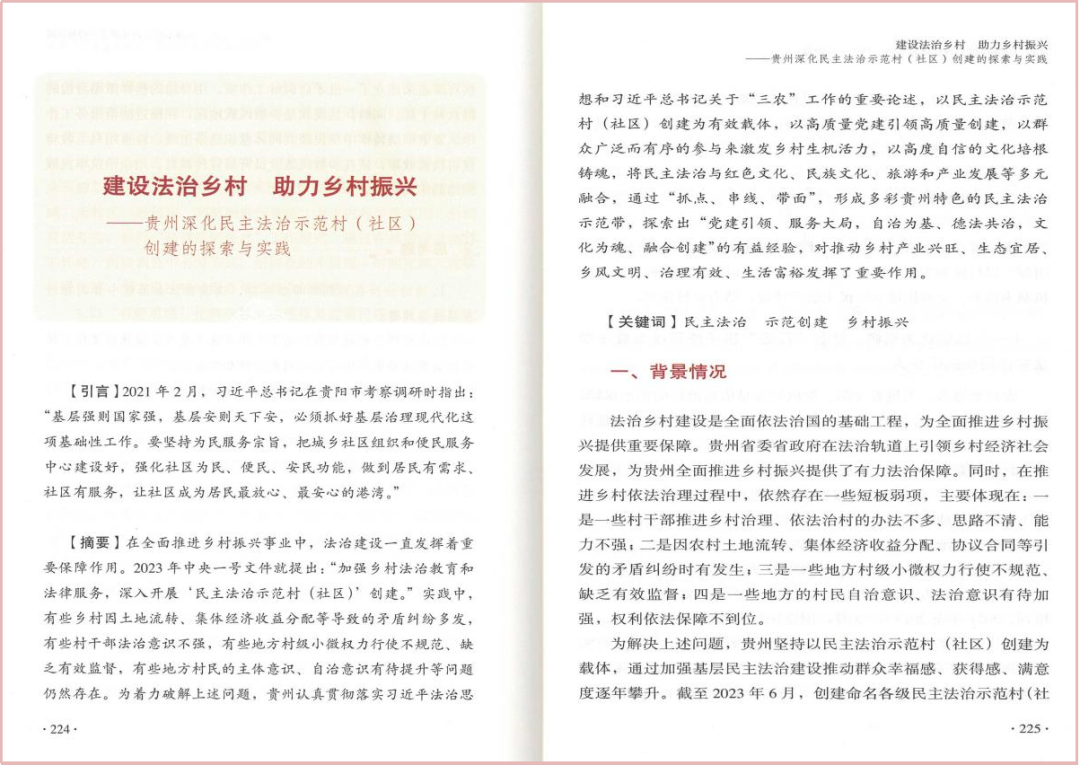《建設法治鄉(xiāng)村 助力鄉(xiāng)村振興—貴州深化民主法治示范村(社區(qū))創(chuàng)建的探索與實踐》入選第六批全國干部學習培訓教材。