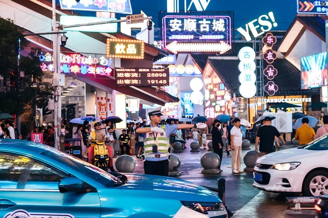 如果說(shuō)景區(qū)交通管理是安順交警的常規(guī)動(dòng)作,那么中心城區(qū)面臨的挑戰(zhàn)則是全新的“考題”。隨著“21℃的城市·360度的人生”城市IP品牌的打響,以安順古城、虹山湖休閑生活區(qū)為首的城區(qū)景點(diǎn)和大街小巷遍布的特色小吃,讓許多游客從“過(guò)境游”向“深度游”、從“景點(diǎn)打卡”向“避暑度假”轉(zhuǎn)變,許多游客整個(gè)暑期都在安順度過(guò),感受迷人風(fēng)光、深厚底蘊(yùn)與夏日清涼的獨(dú)特魅力。今年7月起,安順古城單日平均接待游客10萬(wàn)人次,最高峰達(dá)到18萬(wàn)人次,這展示了安順一流旅游城市建設(shè)的成果,但是在道路資源變化不大的情況下,群眾日常出行疊加游客自駕出行需求,讓城市交通流量大幅增加,給道路交通管理帶來(lái)了極大挑戰(zhàn)。