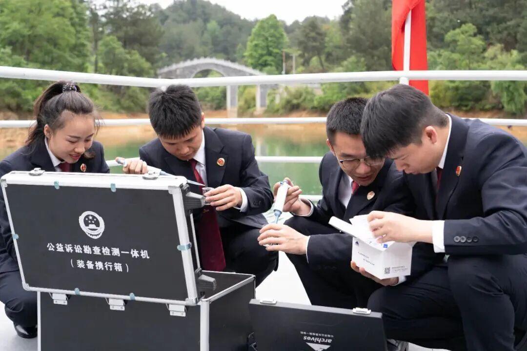 圖為檢察人員開展水污染檢測(cè)調(diào)查取證工作。