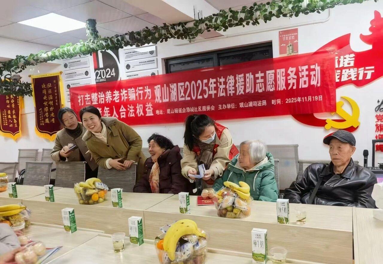 2025年11月19日,貴州省貴陽市觀山湖區(qū)觀山街道金海域居委會(huì)組織開展老年人集體生日活動(dòng),觀山湖區(qū)司法局觀山司法所順勢(shì)而為同步開展預(yù)防養(yǎng)老詐騙主題宣傳活動(dòng),通過發(fā)放宣傳資料與互動(dòng)教學(xué)相結(jié)合的方式,為老年群眾提供防詐知識(shí)“生日禮”。