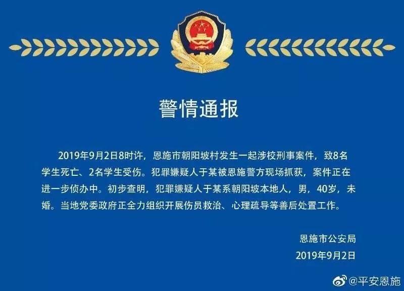 9月2日11時(shí),湖北省恩施市政府官網(wǎng)發(fā)布通報(bào)稱,當(dāng)日8時(shí)許,恩施市白楊坪鎮(zhèn)朝陽坡小學(xué)發(fā)生一起傷人事件,有10名學(xué)生受傷。該消息經(jīng)主流媒體轉(zhuǎn)載后震驚輿論場(chǎng),網(wǎng)民驚呼“血色開學(xué)日”。當(dāng)日晚22時(shí),“@平安恩施”發(fā)布通報(bào)稱,目前有8名學(xué)生死亡、2名學(xué)生受傷,犯罪嫌疑人于某系本地人,40歲,未婚。通報(bào)發(fā)出不久被刪除,引發(fā)網(wǎng)民追問,官方信息管控措施遭到輿論批評(píng)。隨后,《南方周末》等媒體介入報(bào)道,有關(guān)嫌疑人犯罪前科、服刑減刑經(jīng)歷等細(xì)節(jié)被曝光,關(guān)于其作案動(dòng)機(jī)的猜測(cè)充斥網(wǎng)絡(luò)。該案發(fā)生后,國家衛(wèi)健委派出應(yīng)急專家組,開展受傷學(xué)生醫(yī)療救治等工作,公安部、教育部部署加強(qiáng)中小學(xué)、幼兒園安全工作。目前,案件暫未有最新進(jìn)展公布。