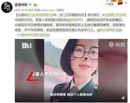 8月26日,封面新聞報(bào)道了云南麗江的一起反殺案,引發(fā)輿論較高關(guān)注。報(bào)道顯示,今年2月8日,麗江永勝縣一退伍女兵唐雪在返家途中遭遇醉酒男子李某某攔截辱罵后發(fā)生肢體沖突。次日凌晨1時(shí)許,李某某持刀擊砸唐家大門,唐雪攜帶刀具出門查看發(fā)生打斗后李某某遇刺身亡。永勝縣檢方認(rèn)定唐雪防衛(wèi)過當(dāng),應(yīng)以故意傷害罪起訴。多數(shù)網(wǎng)民認(rèn)為唐雪屬于弱勢(shì)一方,檢方定性存在問題。8月26日晚間,永勝縣政府新聞辦回應(yīng)稱案件正在辦理中。云南省檢察院也于次日通報(bào)稱,已派專員前往閱卷,對(duì)案件事實(shí)證據(jù)依法全面審查,指導(dǎo)案件辦理。唐雪代理律師殷清利向云南省檢察院提交撤訴申請(qǐng),并稱將作無罪辯護(hù)。隨后,涉案雙方家屬在接受媒體采訪時(shí)披露更多案件細(xì)節(jié),但真相卻疑云密布,案件至今尚無最新進(jìn)展。