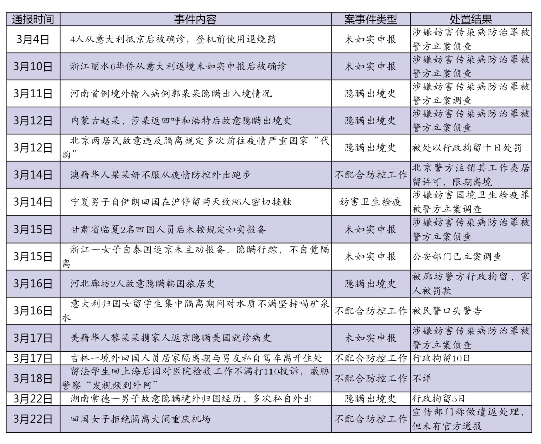 當前,國內(nèi)疫情防控形勢持續(xù)向好,海外疫情卻在加速蔓延,一些境外人員和海外留學(xué)生選擇回國避疫,“外防輸入”成現(xiàn)階段疫情防控工作的重中之重。在此關(guān)鍵時期,少數(shù)人員采取各種手段隱瞞出境史或隱瞞病情,不遵守防疫、隔離等規(guī)定,妨害疫情防控秩序,給我國的疫情防控工作帶來巨大壓力,引發(fā)輿論高度關(guān)注。法制網(wǎng)輿情中心(ID:fzwyqzx)選取3月以來熱度較高的16起個案,簡要分析其類型和處置結(jié)果,梳理輿論觀點,并就后續(xù)處置提出應(yīng)對建議。