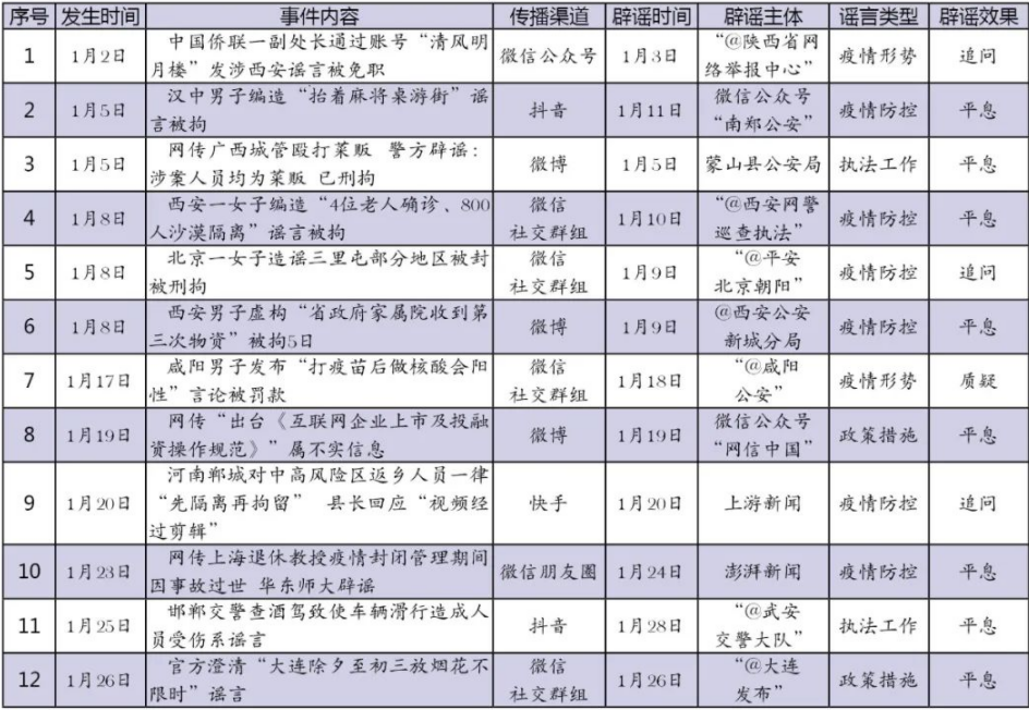 1月網(wǎng)絡(luò)涉法謠言辟謠榜單共梳理、匯總12起熱點事件,圍繞謠言持續(xù)時間、傳播渠道、產(chǎn)生地域、類型以及辟謠平臺等維度綜合分析,并篩選兩起關(guān)注度較高、具有典型意義的案例研判,以期為網(wǎng)絡(luò)辟謠工作提供參考借鑒。