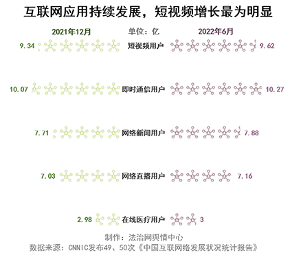 近年來,互聯(lián)網(wǎng)應(yīng)用場(chǎng)景得到極大豐富,短視頻既迎合了互聯(lián)網(wǎng)發(fā)展規(guī)律,又滿足了人們對(duì)多樣化的內(nèi)容需求,用戶數(shù)量不斷攀升。據(jù)第50次《報(bào)告》顯示,截至2022年6月,我國(guó)短視頻的用戶規(guī)模增長(zhǎng)明顯,達(dá)9.62億,較2021年12月增長(zhǎng)2805萬,其用戶規(guī)模增長(zhǎng)量在即時(shí)通信用戶(2042萬)、網(wǎng)絡(luò)新聞?dòng)脩簦?698萬)、網(wǎng)絡(luò)直播用戶(1290萬)、在線醫(yī)療用戶(196萬)幾大群體中居首。