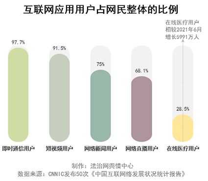 從總體規(guī)模來看,即時(shí)通信用戶規(guī)模達(dá)10.27億,占網(wǎng)民整體的97.7%。短視頻用戶緊隨其后,占網(wǎng)民整體的91.5%。網(wǎng)絡(luò)新聞?dòng)脩粽季W(wǎng)民整體的75.0%。網(wǎng)絡(luò)直播用戶占網(wǎng)民整體的68.1%。在線醫(yī)療用戶占網(wǎng)民整體的28.5%,隨著在線醫(yī)療需求的不斷釋放,在線醫(yī)療行業(yè)呈現(xiàn)出高速發(fā)展態(tài)勢(shì),截至2022年6月,在線醫(yī)療用戶規(guī)模較2021年6月增長(zhǎng)5991萬。